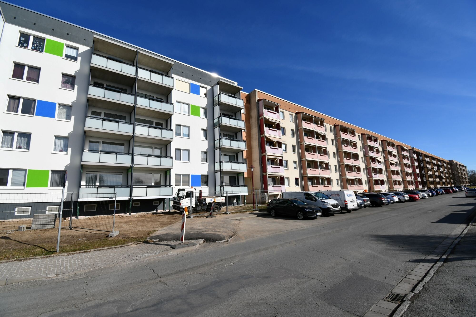 Zusätzlich wird die Dachhaut erneuert und die Fassade malermäßig instandgesetzt. Die farbliche Gestaltung wird dabei konsequent an die bereits sanierten Gebäudeteile angepasst, sodass der lange Wohnblock künftig ein einheitliches und modernes Erscheinungsbild erhält.